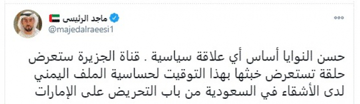 وقال في تغريدة عبر "تويتر" رصدها "المشهد العربي": "حسن النوايا أساس أي علاقة سياسية . قناة الجزيرة ستعرض حلقة تستعرض خبثها بهذا التوقيت لحساسية الملف اليمني لدى الأشقاء في السعودية من باب التحريض على الإمارات".