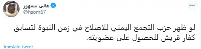 وقال في تغريدة عبر "تويتر" رصدها "المشهد العربي": "لو ظهر حزب التجمع اليمني للإصلاح في زمن النبوة لتسابق كفار قريش للحصول على عضويته".