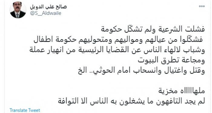 وكتب في تغريدة عبر "تويتر" رصدها "المشهد العربي": "فشلت الشرعية ولم تشكّل حكومة فشكّلوا من عيالهم ومواليهم ومتحوليهم حكومة أطفال وشباب لإلهاء الناس عن القضايا الرئيسية من انهيار عملة ومجاعة تطرق البيوت وقتل واغتيال وانسحاب أمام الحوثي.. الخ".