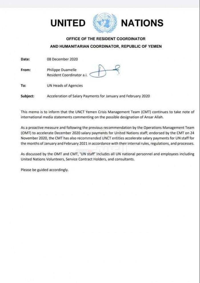 وأضافت المصادر، أن الأمم المتحدة طلبت من مكاتبها في صنعاء، صرف رواتب جميع موظفيها لشهري يناير وفبراير 2021 مقدمًا.