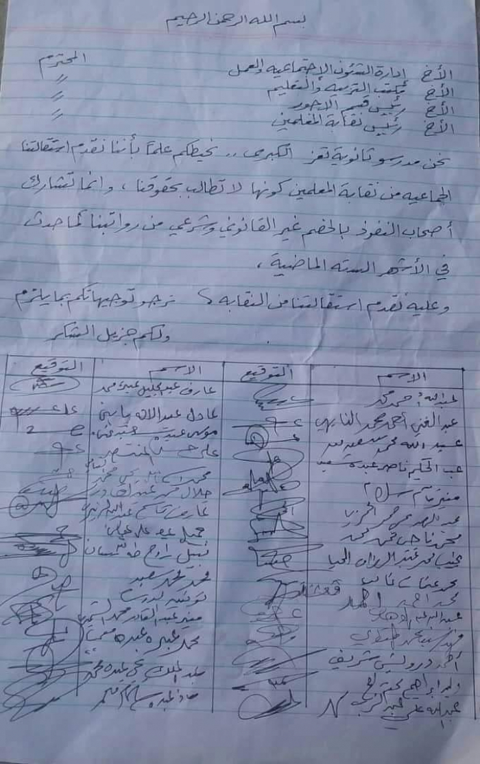 وأرجع بيان للمدرسين المستقيلين، موقفهم إلى تواطؤ النقابة في إهدار حقوقهم بمشاركة أصحاب النفوذ من قيادات المليشيا الإرهابية الخصم غير القانوني من مرتباتهم، خلال الأشهر الستة الماضية.