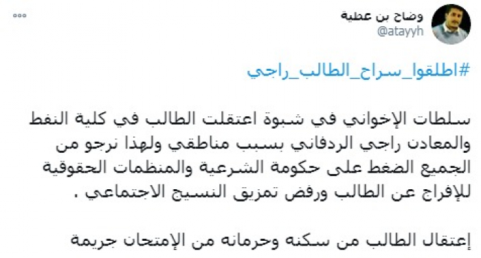 وأشار في تغريدة على حسابه بموقع التدوين المصغر (تويتر)، إلى أنها: "اعتقلت الطالب في كلية النفط والمعادن راجي الردفاني بسبب مناطقي".