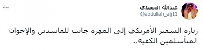 وأكد في تغريدة على حسابه بموقع التدوين المصغر (تويتر)، اليوم، أن: "زيارة السفير الأمريكي إلى المهرة جابت للفاسدين والإخوان المتأسلمين الكفية".