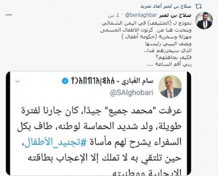 وعلق بن لغبر ردا على الواقعة، قائلا: "نموذج لـ(المتثيقف) في اليمن الشمالي ويتحدث هنا عن كرتون الأطفال المسمى مهزلة وسخرية "حكومة أطفال".