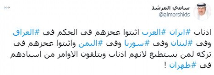 وشدد في تغريدة على حسابه بموقع التدوين المصغر (تويتر)، اليوم، على أن: "أذناب إيران العرب أثبتوا عجزهم في الحكم في العراق وفِي لبنان وفِي سوريا وفِي اليمن".