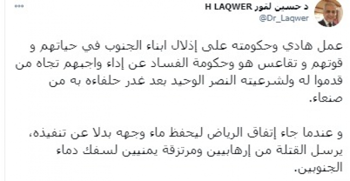وكتب "لقور" في تغريدة عبر حسابه بتويتر، رصدها "المشهد العربي" قال فيها: "عمل هادي وحكومته على إذلال أبناء الجنوب في حياتهم و قوتهم و تقاعس هو وحكومة الفساد عن إداء واجبهم تجاه من قدموا له ولشرعيته النصر الوحيد بعد غدر حلفاءه به من صنعاء".