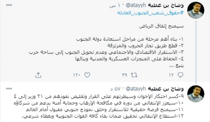 وأكد في تغريدة على حسابه بموقع التدوين المصغر (تويتر)، اليوم، أن اتفاق الرياض: "أهم مرحلة من مراحل استعادة دولة الجنوب"، مضيفا أنه يساعد على: "قطع طريق تجار الحروب والمرتزقة والاستقرار الاقتصادي والاجتماعي وعدم تحويل الجنوب إلى ساحة حرب، و الحفاظ على المنجزات العسكرية والمدنية وبنائها".