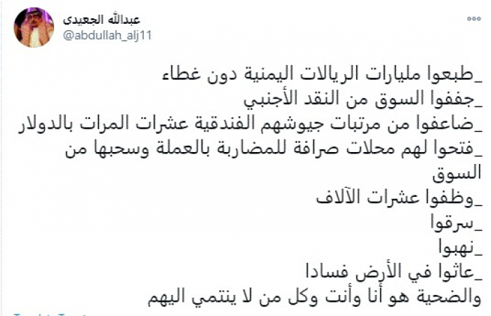 وقال في تغريدة عبر "تويتر" رصدها "المشهد العربي": "طبعوا مليارات الريالات اليمنية دون غطاء وجففوا السوق من النقد الأجنبي وضاعفوا من مرتبات جيوشهم الفندقية عشرات المرات بالدولار وفتحوا لهم محلات صرافة للمضاربة بالعملة وسحبها من السوق ووظفوا عشرات الآلاف سرقوا نهبوا وعاثوا في الأرض فسادا والضحية هو أنا وأنت وكل من لا ينتمي إليهم".