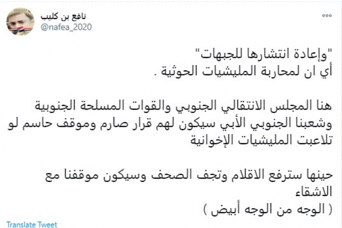 وقال في تغريدة عبر "تويتر" رصدها "المشهد العربي": "وإعادة انتشارها للجبهات أي أن لمحاربة المليشيات الحوثية. هنا المجلس الانتقالي الجنوبي والقوات المسلحة الجنوبية وشعبنا الجنوبي الأبي سيكون لهم قرار صارم وموقف حاسم لو تلاعبت المليشيات الإخوانية".