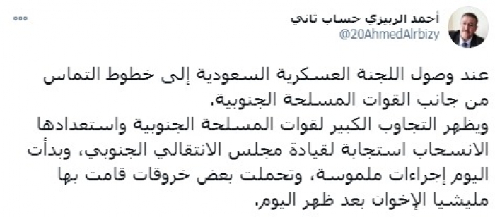 ولفت في تغريدة على حسابه بموقع التدوين المصغر (تويتر)، اليوم، إلى أنه: "عند وصول اللجنة العسكرية السعودية إلى خطوط التماس من جانب القوات المسلحة الجنوبية، يظهر التجاوب الكبير للقوات المسلحة الجنوبية".