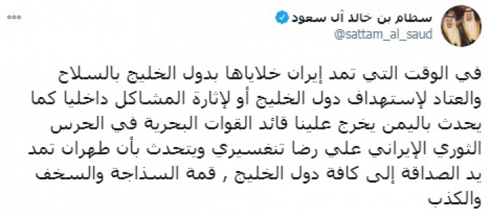 استهجن الأمير السعودي سطام بن خالد آل سعود، إمداد إيران لخلاياها في اليمن بالسلاح، بالتزامن مع مزاعم قيادات نظام الملالي بمد يد الصداقة للخليج.