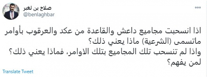 وقال في تغريدة عبر "تويتر" رصدها "المشهد العربي": "إذا انسحبت مجاميع داعش والقاعدة من عكد والعرقوب بأوامر ما تسمى (الشرعية) ماذا يعني ذلك؟".