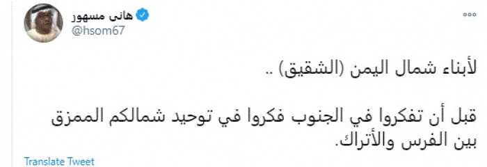 وقال في تغريدة عبر "تويتر" رصدها "المشهد العربي": "لأبناء شمال اليمن (الشقيق).. قبل أن تفكروا في الجنوب فكروا في توحيد شمالكم الممزق بين الفرس والأتراك".