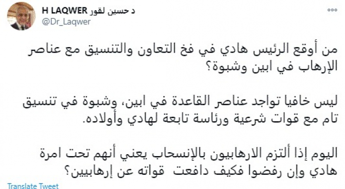 وقال في تغريدة عبر "تويتر" رصدها "المشهد العربي": "من أوقع الرئيس هادي في فخ التعاون والتنسيق مع عناصر الإرهاب في أبين وشبوة؟".