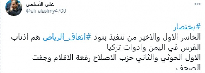 كشف الناشط السياسي علي الأسلمي، اليوم، النقاب عن الأطراف الخاسرة من تنفيذ اتفاق الرياض.