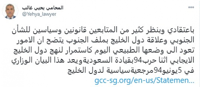وكتب في تغريدة عبر "تويتر" رصدها "المشهد العربي": "باعتقادي وبنظر كثير من المتابعين قانونين وسياسين للشأن الجنوبي وعلاقة دول الخليج بملف الجنوب يتضح أن الأمور تعود إلى وضعها الطبيعي اليوم كاستمرار لنهج دول الخليج الإيجابي أثناء حرب94 بقيادة السعودية ويعد هذا البيان الوزاري في 5 يونيو 94 مرجعية سياسية لدول الخليج."