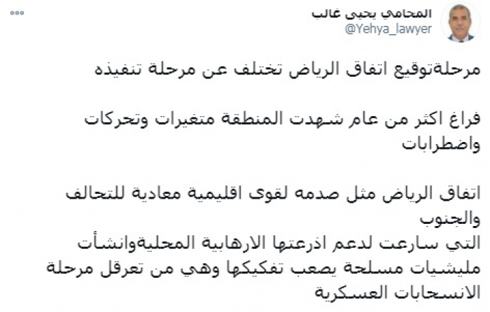وأكد في تغريدة على حسابه بموقع التدوين المصغر (تويتر)، أن: "مرحلة توقيع اتفاق الرياض تختلف عن مرحلة تنفيذه، فراغ أكثر من عام شهدت المنطقة متغيرات وتحركات واضطرابات".