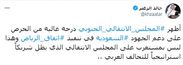 وقال في تغريدة على حسابه بموقع التدوين المصغر (تويتر) : "أظهر المجلس الانتقالي الجنوبي درجة عالية من الحرص على دعم الجهود السعودية في تنفيذ اتفاق الرياض".