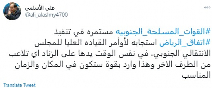 وقال في تغريدة عبر "تويتر" رصدها "المشهد العربي": "القوات المسلحة الجنوبية مستمرة في تنفيذ اتفاق الرياض استجابة لأوأمر القيادة العليا للمجلس الانتقالي الجنوبي".