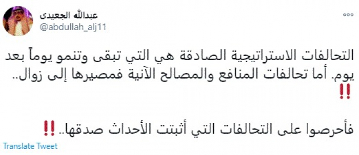 وكتب في تغريدة عبر "تويتر" رصدها "المشهد العربي": "التحالفات الاستراتيجية الصادقة هي التي تبقى وتنمو يومًا بعد يوم. أما تحالفات المنافع والمصالح الآنية فمصيرها إلى زوال".
