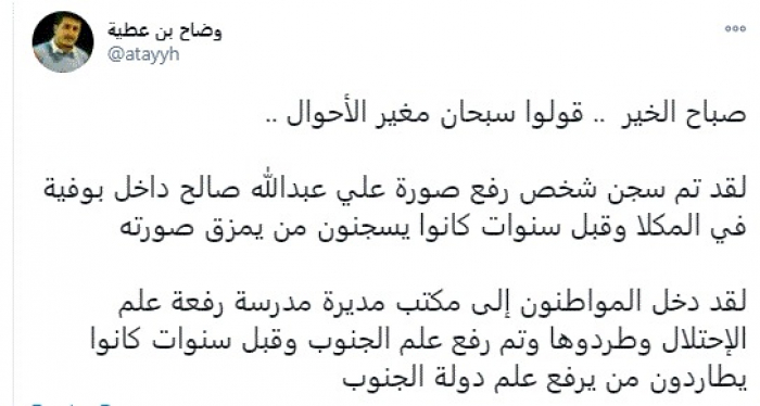وقال في تغريدة عبر "تويتر" رصدها "المشهد العربي": "سبحان مغير الأحوال لقد تم سجن شخص رفع صورة علي عبدالله صالح داخل بوفية في المكلا وقبل سنوات كانوا يسجنون من يمزق صورته".