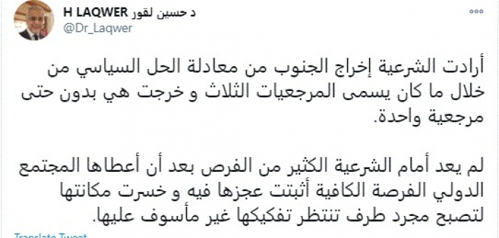وأضاف: "لم يعد أمام الشرعية الكثير من الفرص بعد أن أعطاها المجتمع الدولي الفرصة الكافية أثبتت عجزها فيه و خسرت مكانتها لتصبح مجرد طرف تنتظر تفكيكها غير مأسوف عليها".