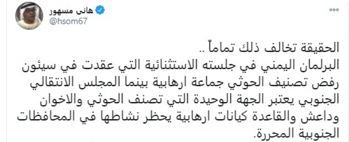 وكتب في تغريدة عبر "تويتر" رصدها "المشهد العربي": "الحقيقة تخالف ذلك تمامًا.. البرلمان اليمني في جلسته الاستثنائية التي عقدت في سيئون رفض تصنيف الحوثي جماعة إرهابية بينما المجلس الانتقالي الجنوبي يعتبر الجهة الوحيدة التي تصنف الحوثي والإخوان وداعش والقاعدة كيانات إرهابية يحظر نشاطها في المحافظات الجنوبية المحررة".