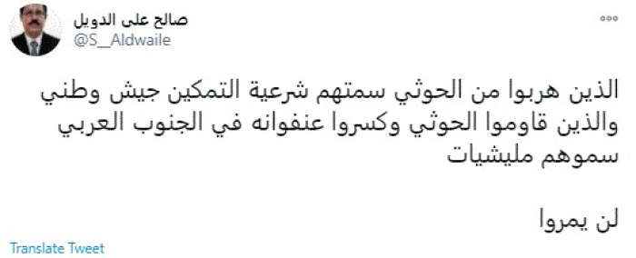 وقال في تغريدة عبر "تويتر" رصدها "المشهد العربي": "الذين هربوا من الحوثي سمتهم شرعية التمكين جيش وطني والذين قاوموا الحوثي وكسروا عنفوانه في الجنوب العربي سموهم مليشيات لن يمروا".