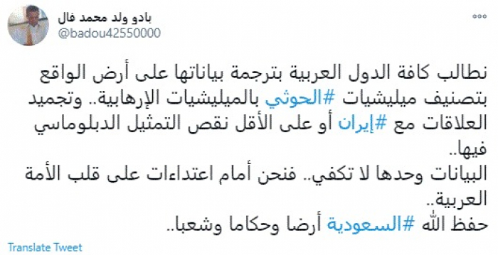 طالب الكاتب الصحفي الموريتاني بادو ولد محمد فال، اليوم، الدول العربية بتجميد العلاقات مع إيران وتصنيف مليشيات الحوثي على لائحة الإرهاب.