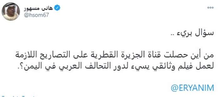 وقال في تغريدة عبر "تويتر" رصدها "المشهد العربي": "سؤال بريء.. من أين حصلت قناة الجزيرة القطرية على التصاريح اللازمة لعمل فيلم وثائقي يسيء لدور التحالف العربي في اليمن؟".