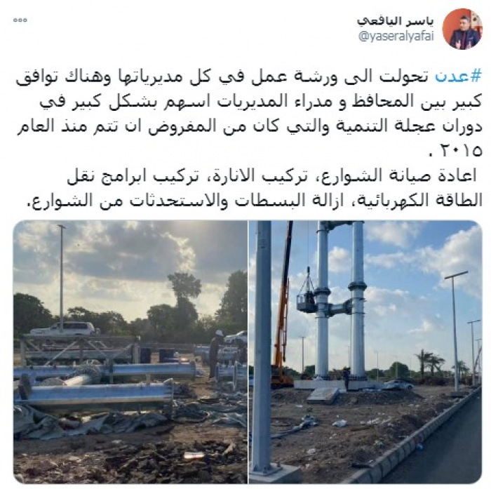 وقال في تغريدة على حسابه بموقع التدوين المصغر (تويتر) اليوم إن: "عدن تحولت إلى ورشة عمل في كل مديرياتها"، مضيفا أن: "هناك توافقا كبيرا بين المحافظ ومدراء المديريات أسهم بشكل كبير في دوران عجلة التنمية، والتي كان من المفروض أن تتم منذ العام ٢٠١٥".