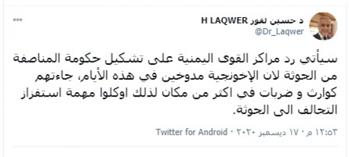 وكتب "لقور" تغريدة عبر حسابه بتويتر، رصدها "المشهد العربي": "سيأتي رد مراكز القوى اليمنية على تشكيل حكومة المناصفة من الحوثة لأن الإخونجية مدوخين في هذه الأيام، جاءتهم كوارث و ضربات في أكثر من مكان لذلك أوكلوا مهمة استفزاز التحالف إلى الحوثة".