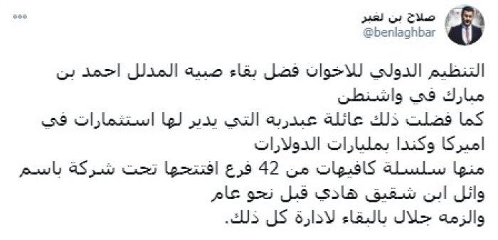 كشف الإعلامي صلاح بن لغبر، عن إدارة المدعو أحمد بن مبارك في الولايات المتحدة، استثمارات عائلة الرئيس اليمني المؤقت عبدربه منصور هادي، بتعليمات من التنظيم الدولي للإخوان.