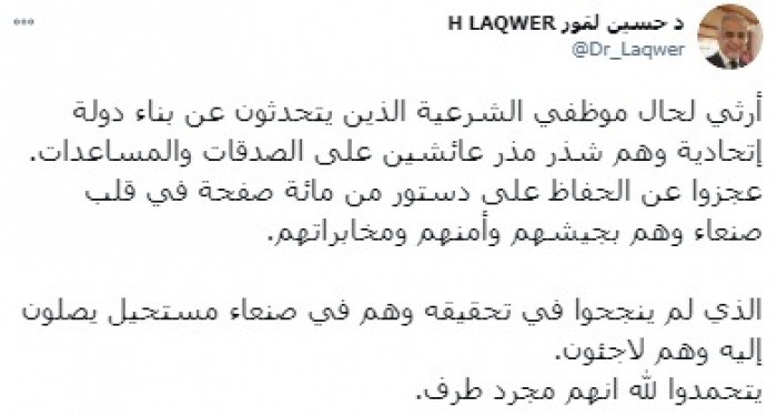 وقال في تغريدة على حسابه بموقع التدوين المصغر (تويتر)، اليوم إني: "أرثي لحال موظفي الشرعية الذين يتحدثون عن بناء دولة اتحادية وهم شذر مذر عائشين على الصدقات والمساعدات".