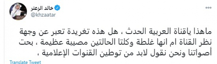 وقال في تغريدة عبر "تويتر" رصدها "المشهد العربي": "ما هذا ياقناة العربية الحدث، هل هذه تغريدة تعبر عن وجهة نظر القناة أم أنها غلطة وكلتا الحالتين مصيبة عظيمة، بحت أصواتنا ونحن نقول لابد من توطين القنوات الإعلامية".