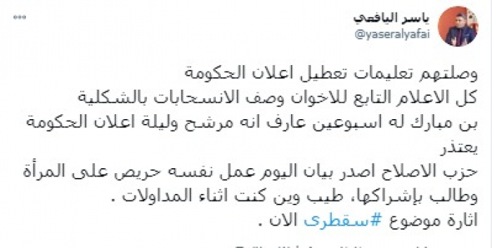 وقال في تغريدة على حسابه بموقع التدوين المصغر (تويتر)، اليوم إنهم: "وصلتهم تعليمات تعطيل إعلان الحكومة، كل الإعلام التابع للإخوان وصف الانسحابات بالشكلية".