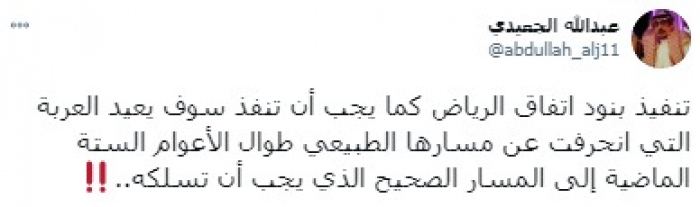 وشدد في تغريدة على حسابه بموقع التدوين المصغر (تويتر)، اليوم على أن: "تنفيذ بنود اتفاق الرياض كما يجب أن تنفذ سوف يعيد العربة التي انحرفت عن مسارها الطبيعي طوال الأعوام الستة الماضية إلى المسار الصحيح الذي يجب أن تسلكه".