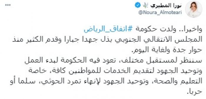 وقالت في تغريدة على حسابها بموقع التدوين المصغر (تويتر)، اليوم: "وأخيرا.. ولدت حكومة اتفاق الرياض، المجلس الانتقالي الجنوبي بذل جهدًا جبارًا وقدم الكثير منذ حوار جدة ولغاية اليوم".