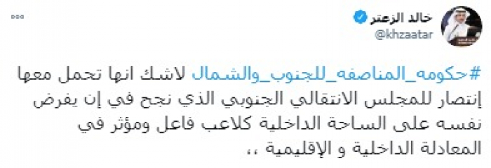 أكد المحلل السياسي السعودي خالد الزعتر، أن المجلس الانتقالي الجنوبي لاعب مؤثر داخليا وإقليميا، مشددا على أن حكومة المناصفة أحد انتصاراته.