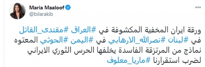 وقالت في تغريدة عبر "تويتر" رصدها "المشهد العربي": "ورقة إيران المخفية المكشوفة في العراق مقتدى القاتل، في لبنان نصرالله الإرهابي، في اليمن الحوثي المعتوه، نماذج من المرتزقة الفاسدة يخلفها الحرس الثوري الإيراني لضرب استقرارنا".