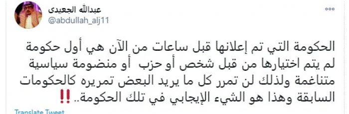 وقال في تغريدة عبر "تويتر" رصدها "المشهد العربي": "الحكومة التي تم إعلانها قبل ساعات من الآن هي أول حكومة لم يتم اختيارها من قبل شخص أو حزب أو منظومة سياسية متناغمة ولذلك لن تمرر كل ما يريد البعض تمريره كالحكومات السابقة وهذا هو الشيء الإيجابي في تلك الحكومة".
