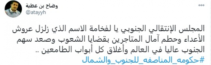 وقال في تغريدة عبر "تويتر" رصدها "المشهد العربي": "المجلس الانتقالي الجنوبي يا لفخامة الاسم الذي زلزل عروش الأعداء وحطم آمال المتاجرين بقضايا الشعوب وصعد سهم الجنوب عاليًا في العالم وأغلاق كل أبواب الطامعين.. حكومة المناصفة للجنوب والشمال".