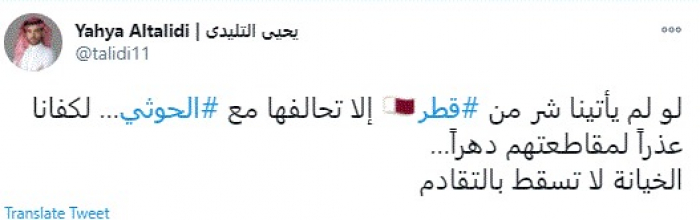 وقال في تغريدة عبر "تويتر" رصدها "المشهد العربي": "لو لم يأتينا شر من قطر إلا تحالفها مع الحوثي… لكفانا عذرًا لمقاطعتهم دهرًا… الخيانة لا تسقط بالتقادم".