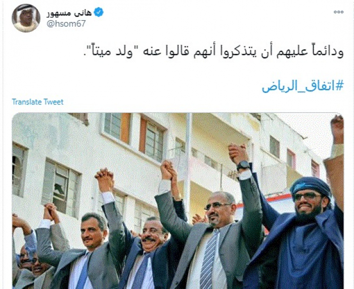 وقال في تغريدة عبر "تويتر" رصدها "المشهد العربي": "ودائمًا عليهم أن يتذكروا أنهم قالوا عنه ولد ميتًا. اتفاق الرياض".