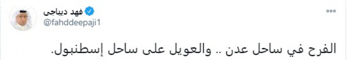 وقال في تغريدة عبر "تويتر" رصدها "المشهد العربي": "الفرح في ساحل عدن .. والعويل على ساحل إسطنبول".