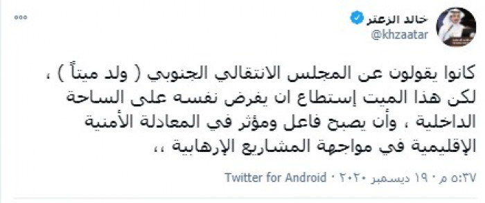 وكتب "الزعتر" تغريدة عبر حسابه بتويتر، رصدها "المشهد العربي" قال فيها: "كانوا يقولون عن المجلس الانتقالي الجنوبي ( ولد ميتًا ) ، لكن هذا الميت استطاع أن يفرض نفسه على الساحة الداخلية ، وأن يصبح فاعلا ومؤثرا في المعادلة الأمنية الإقليمية في مواجهة المشاريع الإرهابية".
