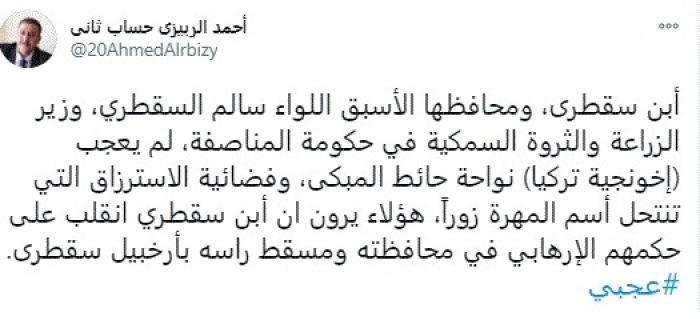 وقال في تغريدة عبر "تويتر" رصدها "المشهد العربي": "ابن سقطرى، ومحافظها الأسبق اللواء سالم السقطري، وزير الزراعة والثروة السمكية في حكومة المناصفة، لم يعجب (إخونجية تركيا) نواحة حائط المبكى، وفضائية الاسترزاق التي تنتحل اسم المهرة زورً، هؤلاء يرون ان ابن السقطري انقلب على حكمهم الإرهابي في محافظته ومسقط راسه بأرخبيل سقطرى".