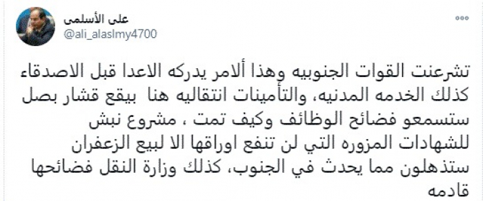 وقال في تغريدة عبر "تويتر" رصدها "المشهد العربي": "تشرعنت القوات الجنوبية وهذا الأمر يدركه الأعداء قبل الأصدقاء كذلك الخدمة المدنية، والتأمينات انتقالية هنا بيقع قشار بصل ستسمعوا فضائح الوظائف وكيف تمت، مشروع نبش للشهادات المزورة التي لن تنفع أوراقها إلا لبيع الزعفران ستذهلون مما يحدث في الجنوب، كذلك وزارة النقل فضائحها قادمة".