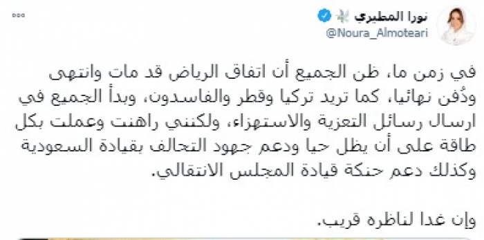 وأشارت في تغريدة على حسابها بموقع التدوين المصغر (تويتر) اليوم، إلى أنه: "في زمن ما، ظن الجميع أن اتفاق الرياض قد مات وانتهى ودُفن نهائيا، كما تريد تركيا وقطر والفاسدون، وبدأ الجميع في إرسال رسائل التعزية والاستهزاء".