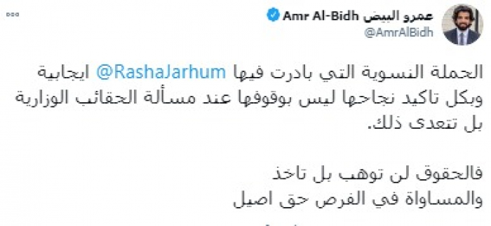 وشدد في تغريدة على حسابه بموقع التدوين المصغر (تويتر)، اليوم على أن: " الحملة النسوية التي بادرت فيها رشا جرهوم، إيجابية وبكل تأكيد نجاحها ليس بوقوفها عند مسألة الحقائب الوزارية بل تتعدى ذلك".